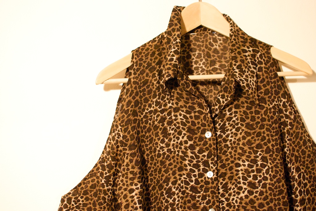 Here’s this weeks DIY. I bought a cute leopard print sheer silk shirt from a charity shop during my mid-week lunchtime thrifting (£1.50) and decided that it was time I got some shoulderless shirt action.
