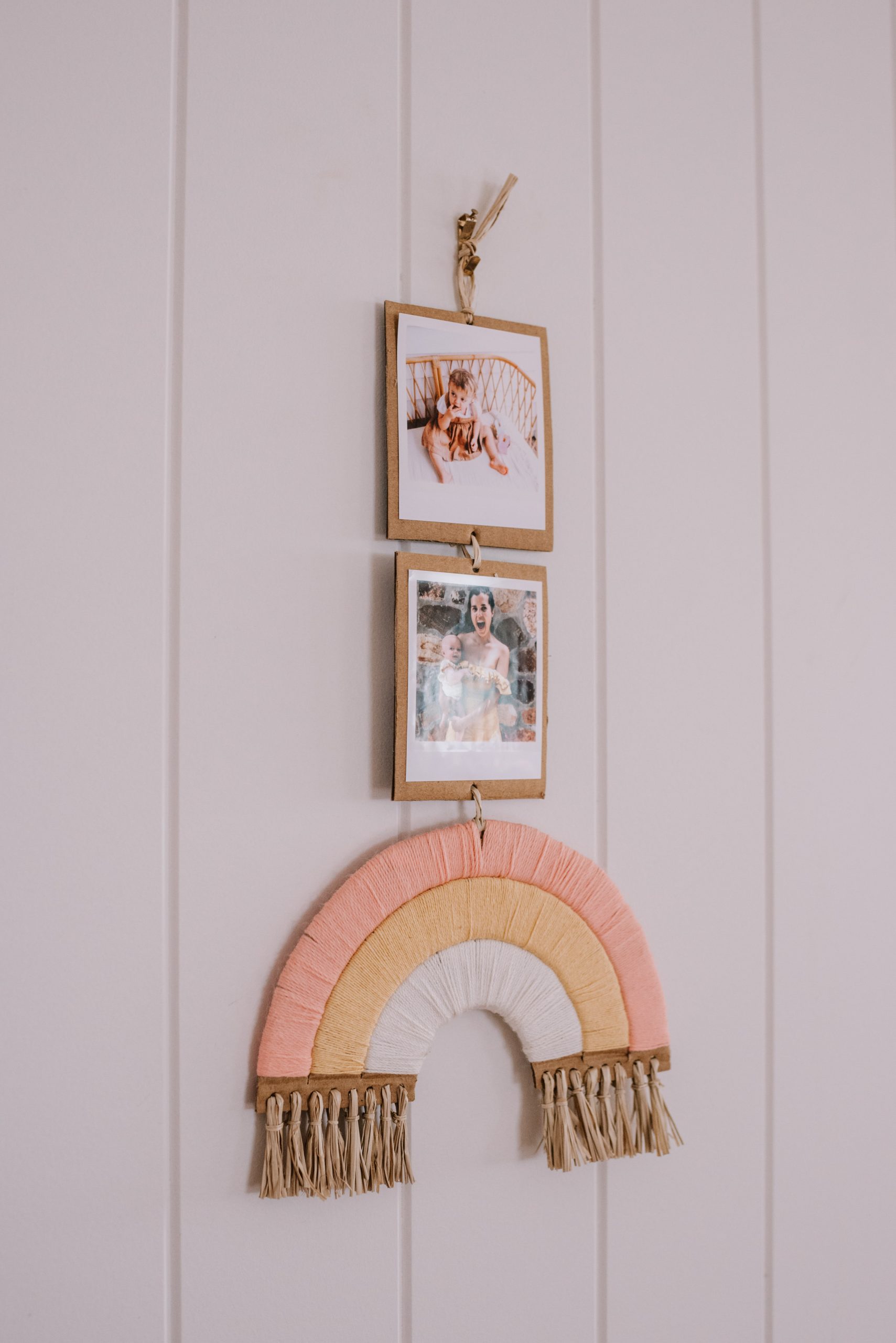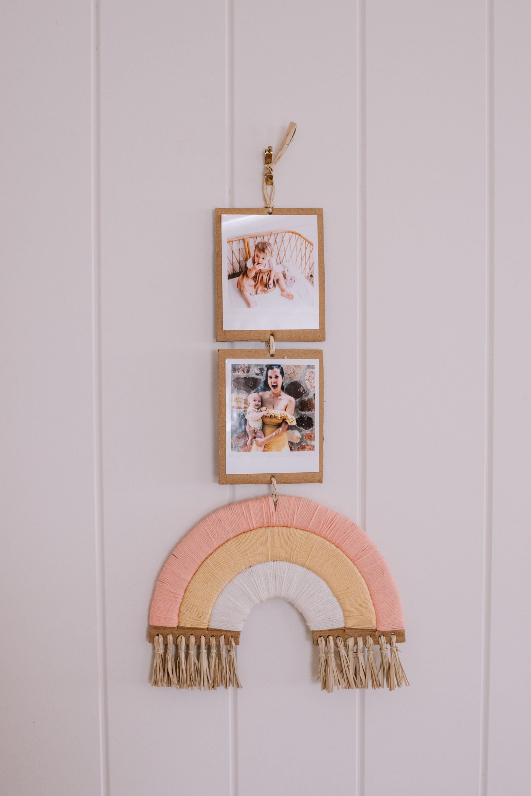Recently I came up with the concept of creating a rainbow wall hanging using cardboard, with cute little hanging photo frames made from cardboard. I really like the idea of using what you have on hand, and who doesn’t have an old cardboard box?