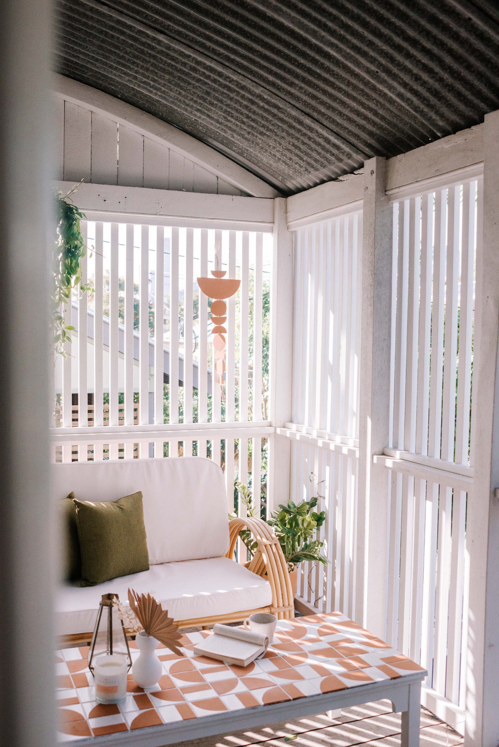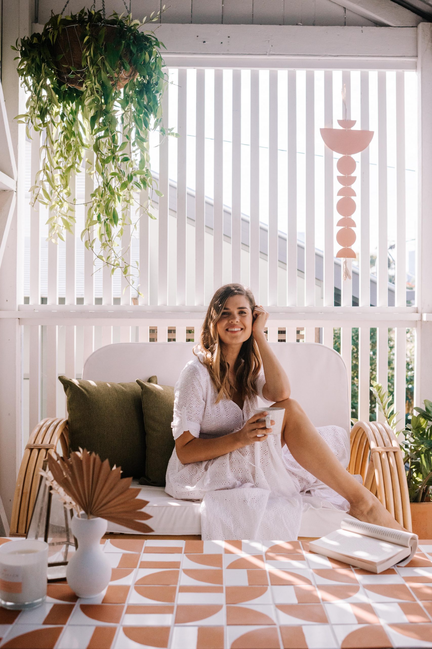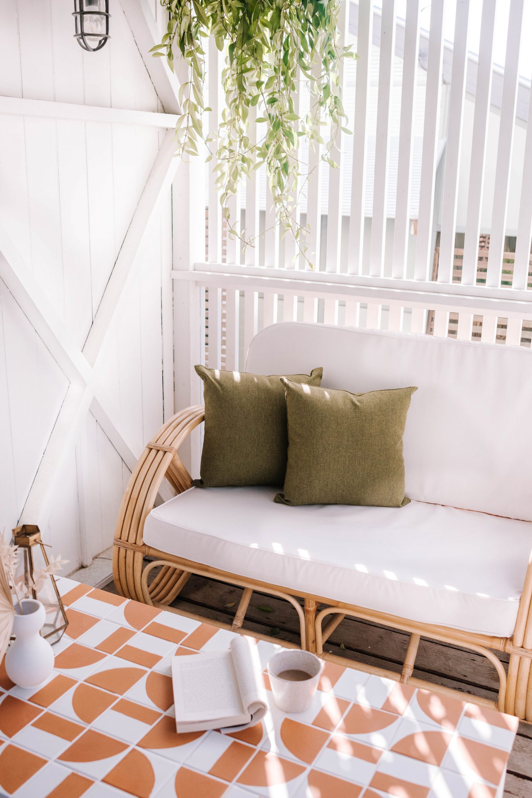 As some of you will already know, a little while ago we made a few changes to the front and the back of our house – adding wooden battens and pop out panels. They have added amazing privacy and have also kept our little gymnast Frankie from falling out! Since then I’ve been meaning to style the front deck but haven’t had the chance. I’ve spent a long time looking for furniture that would suit this space and stand up to the elements outside. I finally decided to get creative, and am excited to work with Sunbrella to give this space a little spruce. Sunbrella is the world leader in performance fabrics, which are amazing because they’re water resistant and mold resistant, and are also machine washable so are perfect if you’ve got kids! I knew they would be the perfect foundation for a calm and inviting deck.