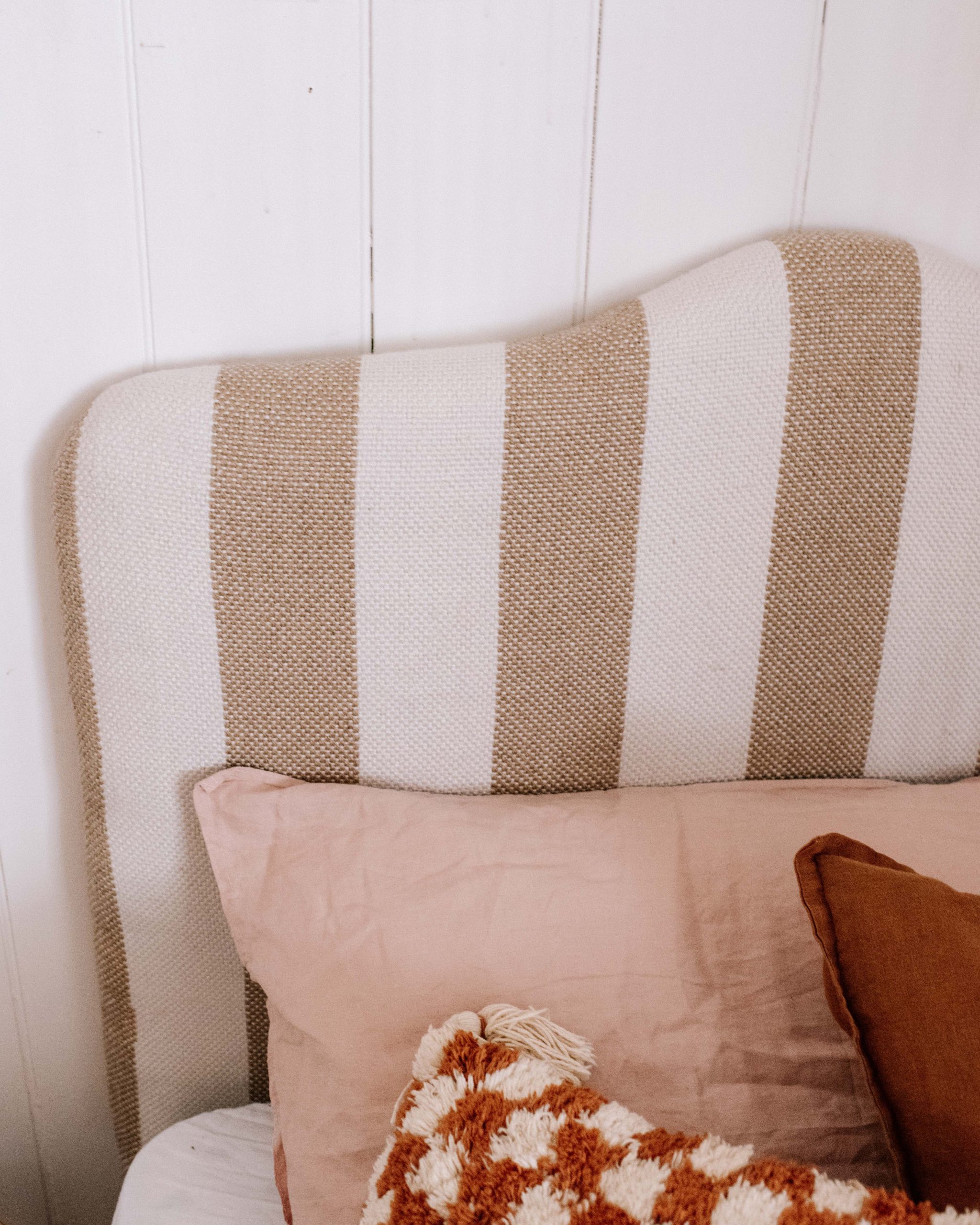 Once I had the rug trimmed to a more manageable size, I began stapling. When upholstering make sure to keep the fabric pulled as tight as you can, this will ensure you have a nice smooth finish. I'd suggest doing the top and bottom first and then finishing with the side. I also found it helpful to kneel on the headboard so that the foam would compress down allowing me to pull the fabric even tighter! You'll also need to keep checking to make sure the stripes are straight and centred at the front.