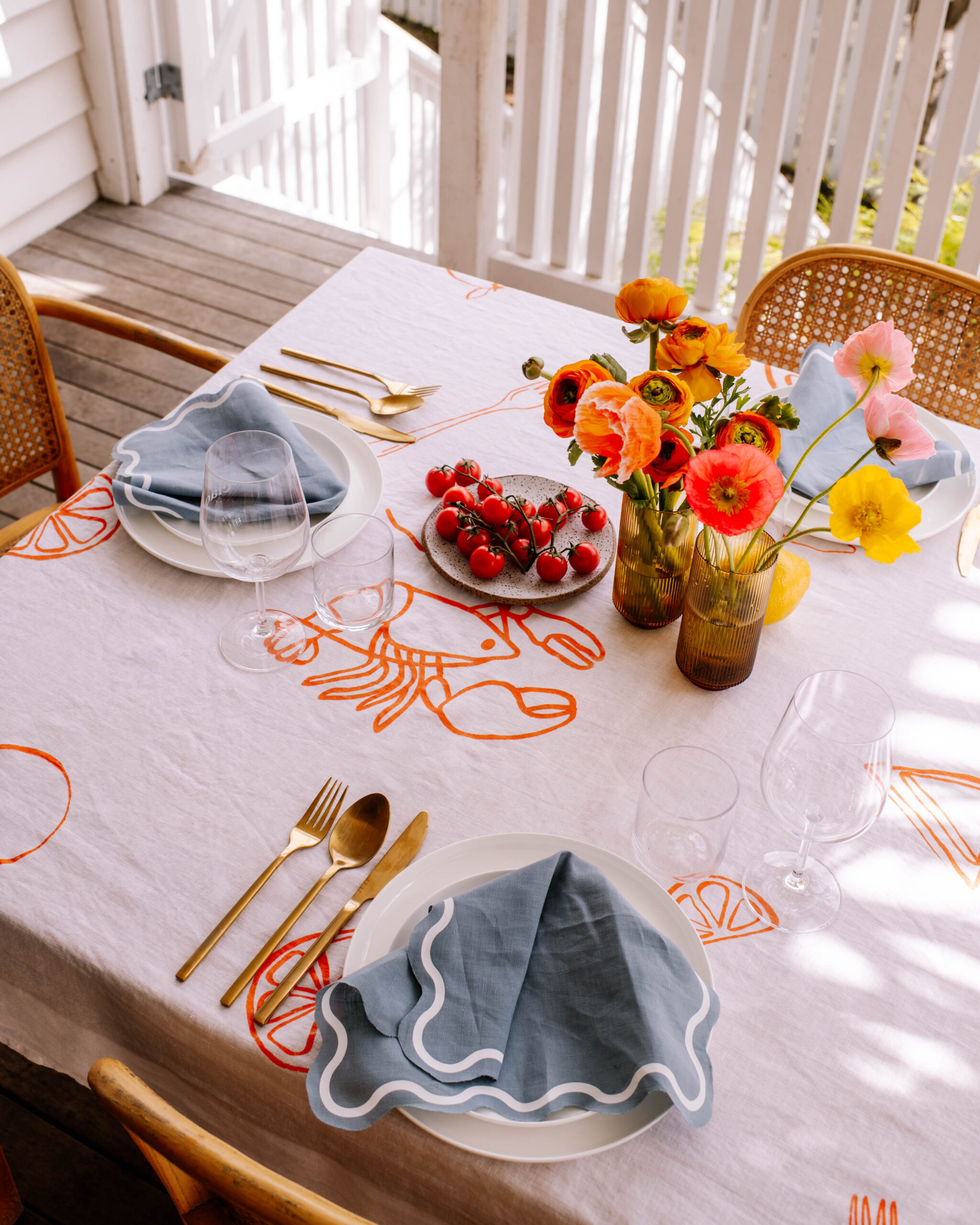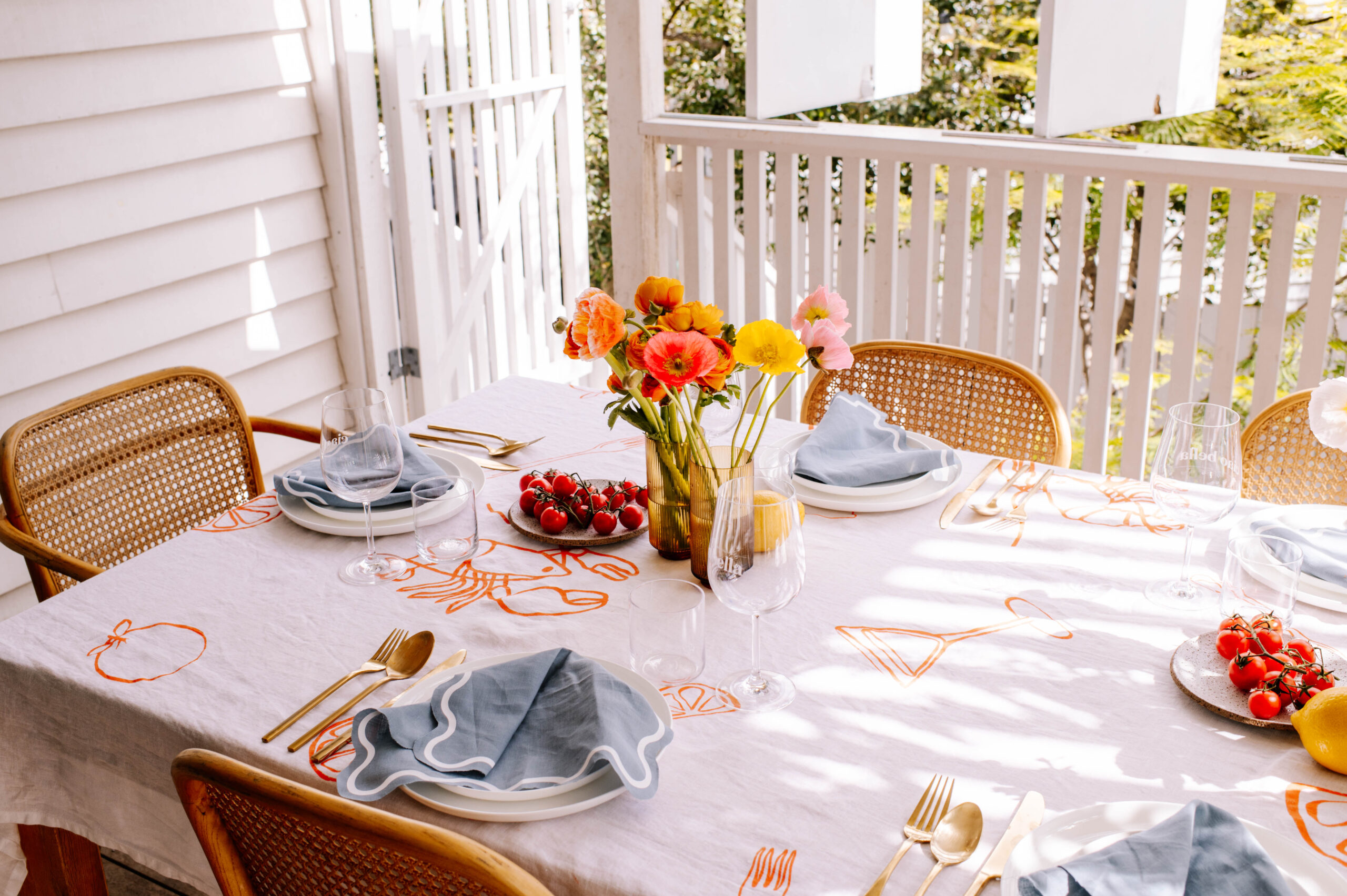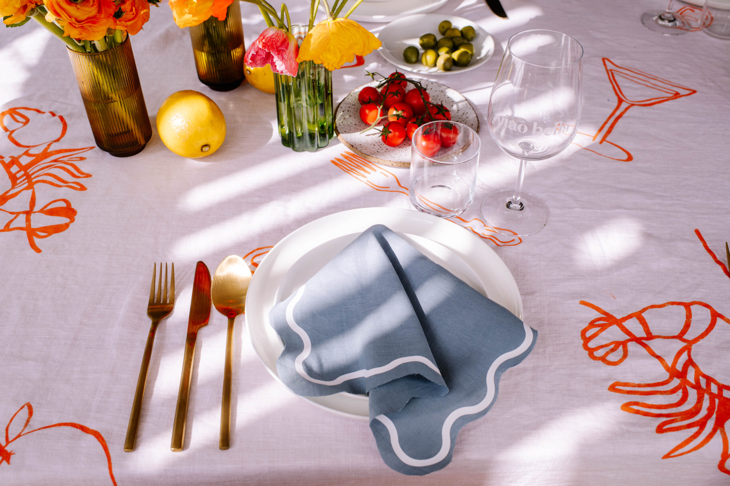 I really wanted to give a seaside Italian holiday vibe with a touch of playfulness, so I decided to make the personalised tablecloth the centre for the design. I’ve also been wanting to make wavy napkins for a long time using my cricut, so I decided this was the perfect time. To top it off, I decided to use my favourite etching cream hack to personalise some glassware. To create the look, I made my design using the Design Space app, customising the colours and getting the look just right. I used the font Didot for the lettering, and simply picked images and shapes from the Design Space library to create the other items. You can access my design here.