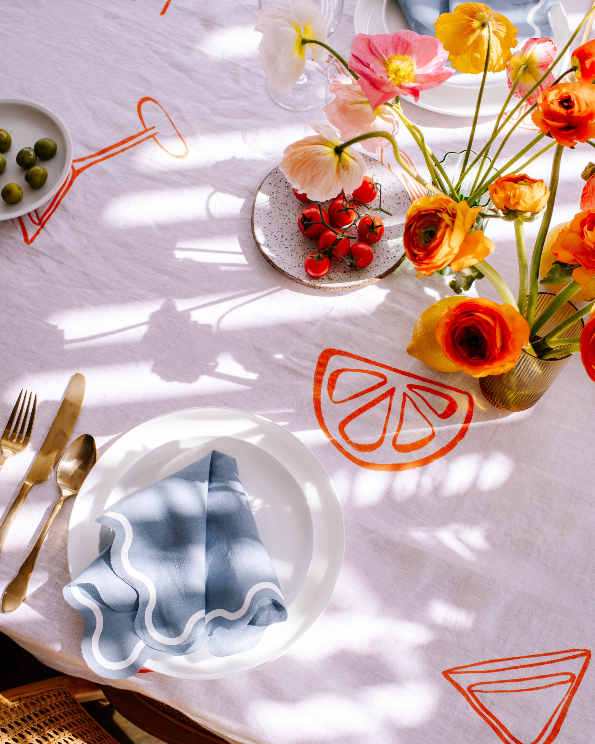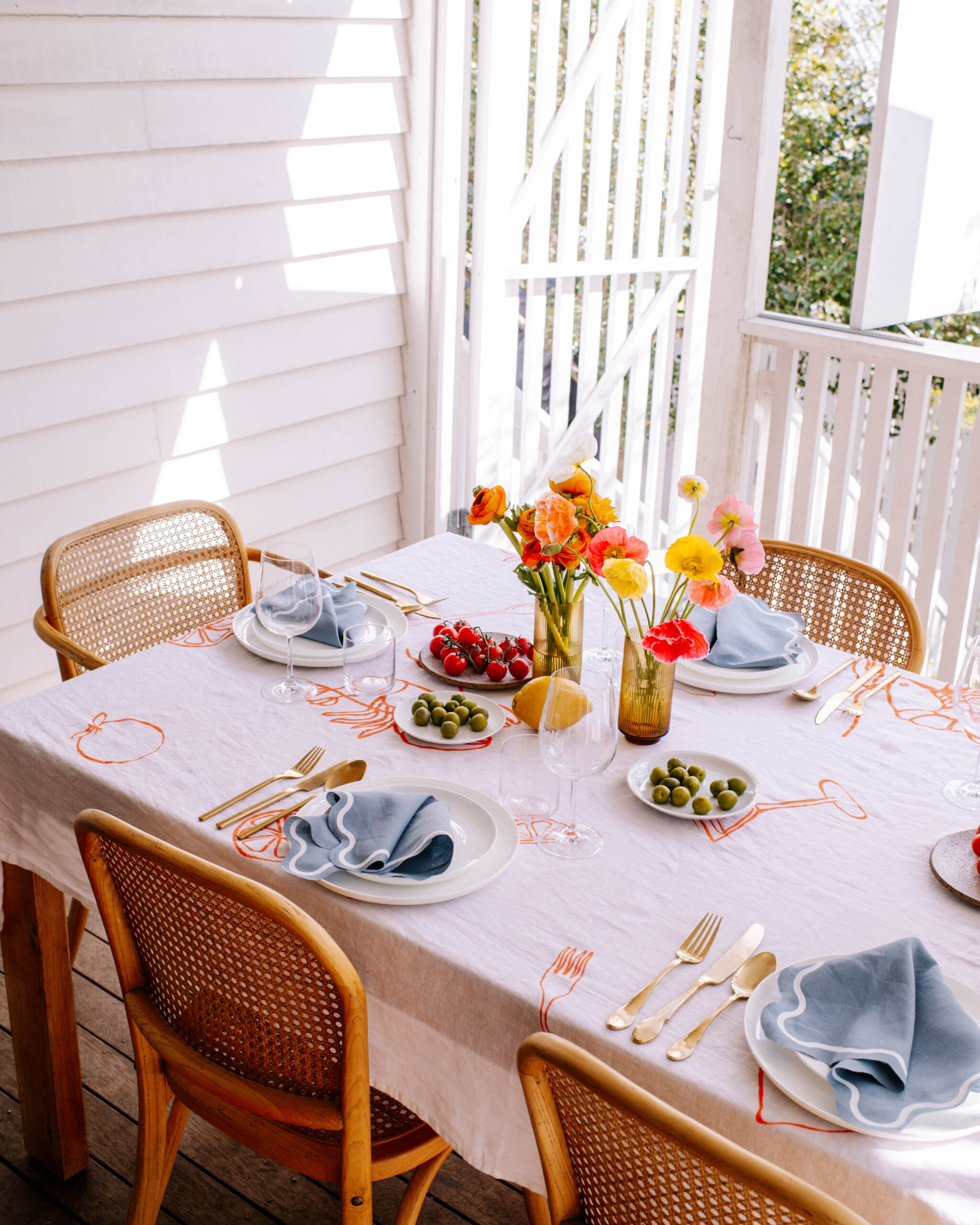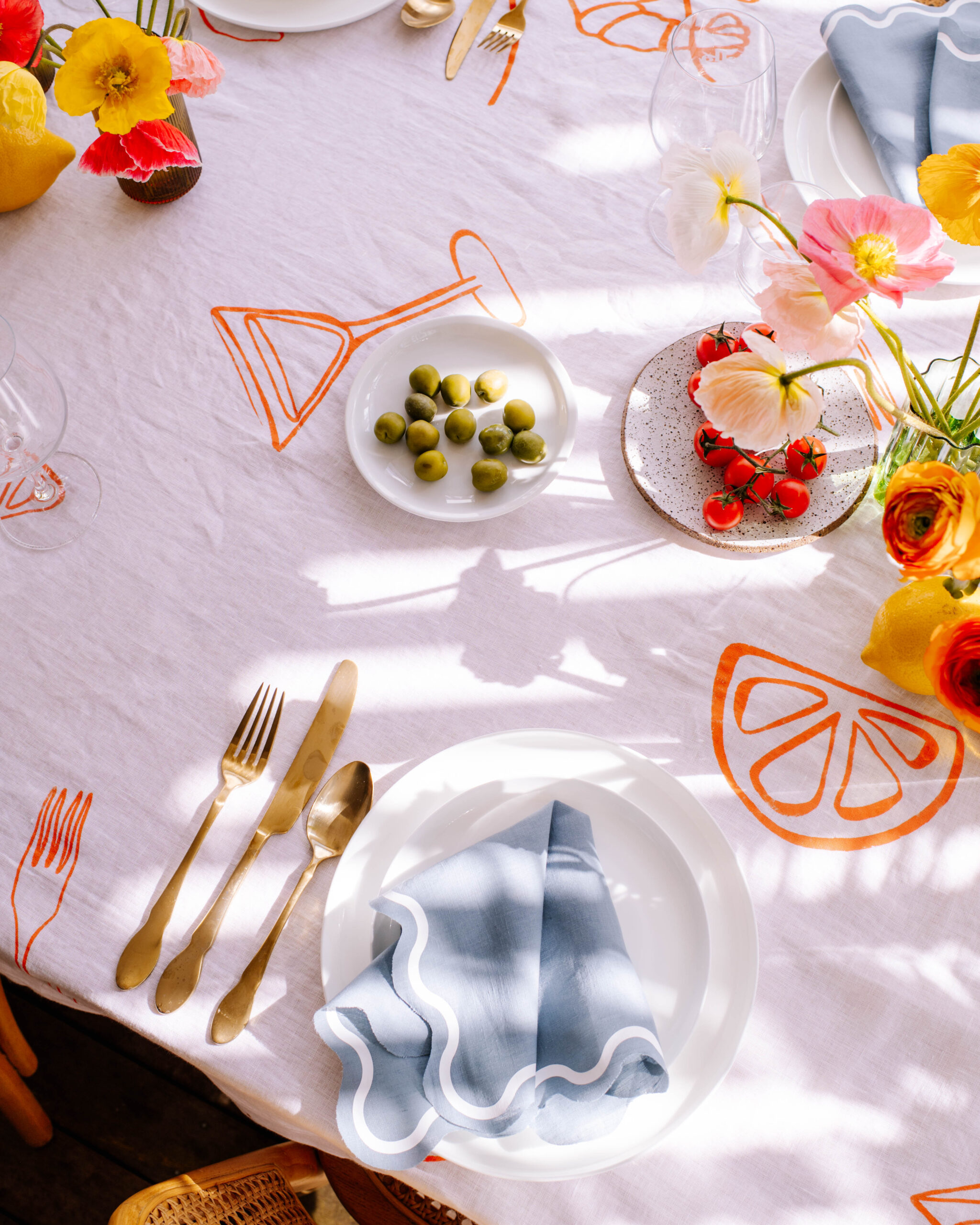 I really wanted to give a seaside Italian holiday vibe with a touch of playfulness, so I decided to make the personalised tablecloth the centre for the design. I’ve also been wanting to make wavy napkins for a long time using my cricut, so I decided this was the perfect time. To top it off, I decided to use my favourite etching cream hack to personalise some glassware. To create the look, I made my design using the Design Space app, customising the colours and getting the look just right. I used the font Didot for the lettering, and simply picked images and shapes from the Design Space library to create the other items. You can access my design here.
