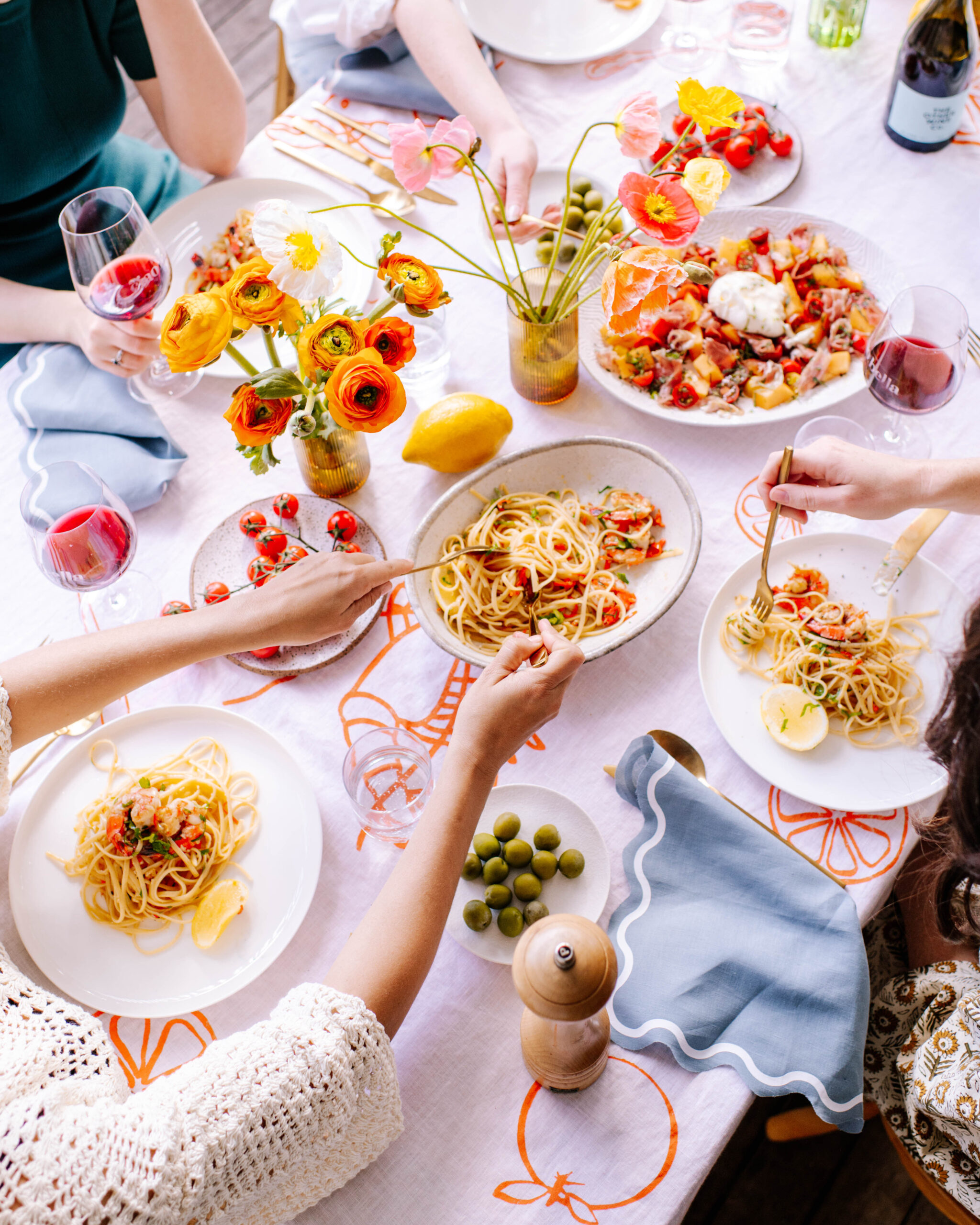 Every year I tell myself I’m going to host a lunch for my birthday, and I finally got around to it this year. I decided to make it Italian themed – wine, pasta and seafood. I decided to create a whole bunch of decor to match. Using my Cricut of course! I made a tablecloth, napkins and etched the glassware, and topped that off with yummy food that Ben very kindly made for us. Lots of you wanted to know more about the tablecloth, and luckily I chronicled the whole process while I was making it so I could share it here. Read on for how I did it.