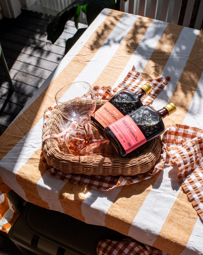 So I thought, what better gift than the gift of a bit of relaxation? To put this together I grabbed a cute tray and then I started with a thrifted glass, then added a handful of colourful beads and a keyring for a small DIY moment – because making something with your hands is such an underrated form of therapy! I tucked in two bottles of Dilmah’s Black Tea Elixir. It’s a tea concentrate and perfect for making cocktails and mocktails. To finish it off, I wrapped the tray with a soft fabric bow to tie everything together.